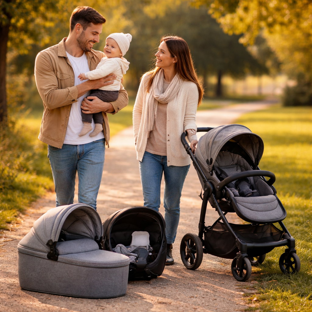 La nacelle est utilisée pour les premiers mois, le siège auto facilite les trajets en voiture, et le siège poussette prend le relais lorsque l’enfant grandit. Tous les éléments sont compatibles avec le même châssis, ce qui évite de multiplier les équipements.